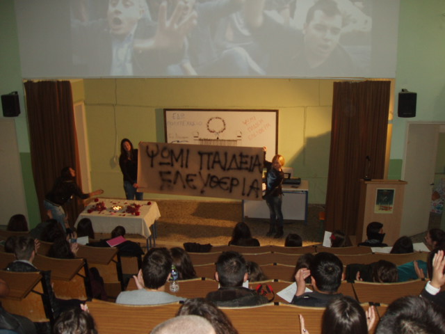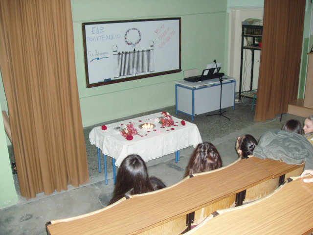 Με αφορμή τον εορτασμό για την επέτειο της εξέγερσης του Πολυτεχνείου πραγματοποιήθηκε στο Αμφιθέατρο του Σχολείου μας εκδήλωση με τίτλο: «Μνήμες Πολυτεχνείου: 1973-2015». Στην εκδήλωση, την οποία παρουσίασαν μαθητές, προβλήθηκε παρουσίαση prezi, που περιελάμβανε το χρονικό της εξέγερσης καθώς και video-μαρτυρίες για τα γεγονότα. Ακούστηκαν απαγγελίες ποιημάτων και διαβάστηκε το προσκλητήριο των νεκρών. Την εκδήλωση πλαισίωσε με τα τραγούδια της η χορωδία του Σχολείου μας. Η γιορτή ολοκληρώθηκε με την παρουσίαση video σχετικού με τους αγώνες της νέας γενιάς.